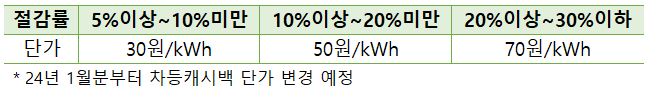 - 절감률 구간별로 1 kwh당 30~70원을 차등 지급합니다.
