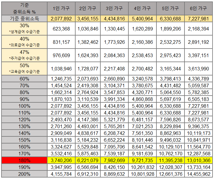 가구원 수에 따른 기준 중위소득 180% 이하에 해당하는 자